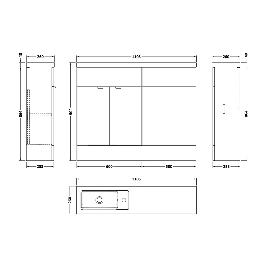 The set consists of a 600mm basin unit and a 500mm WC unit. The external sides of the units are matched to your door choice.